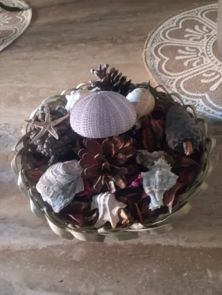 Bonita pieza decorativa que combina elementos del mar y la montaña. Ideal para dar un toque natural a tu hogar. Bonita de coracion para vaño ho casa el caracol es de mar es muy vonito el centro y le echas unas gotas de an bientador y huele todo el dia donde lo pongas - Composición con piñas y conchas marinas. - Base tejida con fibras naturales.y erizo de mar