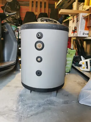 Acumulador agua 100 litros. Ideal para sistemas de calefacción o agua caliente sanitaria. Usado 5 años y vendo por cambio de sistema. - Capacidad: 100 litros. - Color gris con detalles en negro. - Incluye pie.