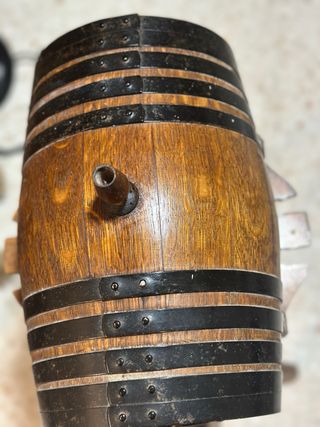 Barril de vino decorativo de madera con pie. - Material: Madera. - Incluye pie de soporte. - Diseño rústico. Esta muy nuevo, Envinado con Pedro Ximenez, con pie, madera