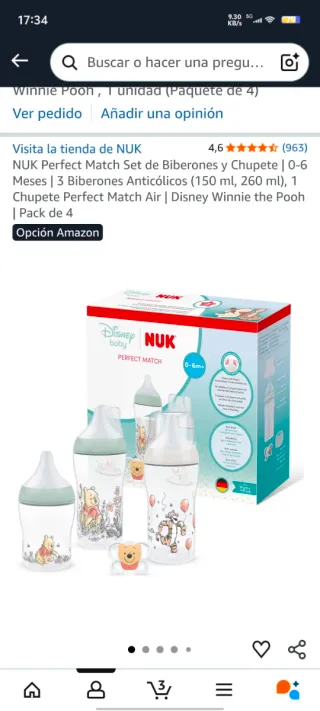 Set de biberones y chupete NUK con diseño de Winnie the Pooh. - Incluye 3 biberones anticólicos (150 ml y 260 ml). - Incluye 1 chupete Perfect Match Air. - Diseñado para bebés de 0 a 6 meses. - Pack de 4 unidades.