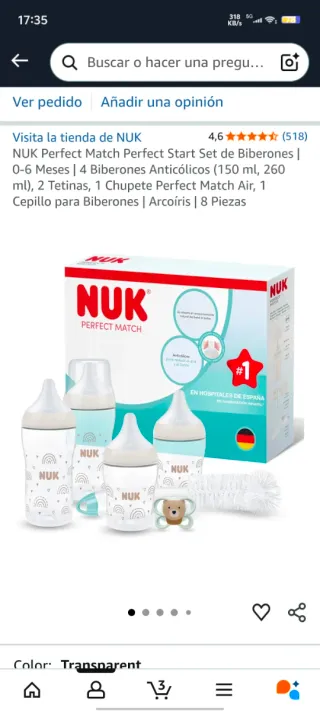 Set de inicio NUK Perfect Match con 4 biberones anticólicos, tetinas y chupete. - 4 Biberones anticólicos (150 ml, 260 ml). - 2 Tetinas. - 1 Chupete Perfect Match Air. - 1 Cepillo para Biberones. - Diseño Arcoíris. - 8 Piezas en total.