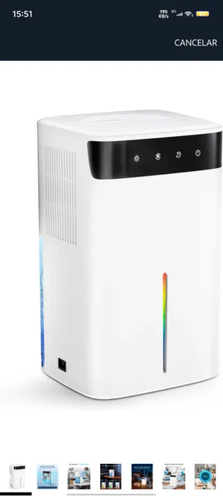 Deshumidificador eléctrico de color blanco con un diseño moderno y compacto. Cuenta con un indicador de nivel de agua visible y un enchufe de repuesto incluido. - Diseño elegante en blanco. - Indicador de nivel de agua con luz LED. - Incluye enchufe de repuesto.