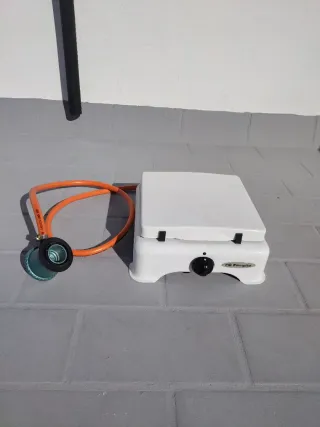 Hornillo de gas portátil, ideal para camping o exteriores. Su diseño compacto lo hace fácil de transportar. - Color blanco. - Incluye manguera y regulador.