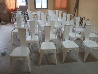 30 sillas metálicas de color blanco, ideales para eventos o espacios de reunión. - Diseño moderno y apilable. - Estructura robusta de metal. 20€ cada unidad