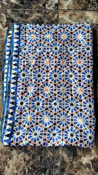 Pañuelo de seda con un diseño inspirado en los motivos de la Alhambra de Granada. - Material: 100% Seda. - Patrón geométrico. - Colores: Azul, blanco, negro, rojo y dorado.