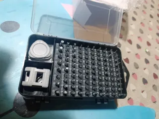 Kit de herramientas para reparación de dispositivos móviles. Incluye un destornillador y varios accesorios. - Mango de destornillador con agarre texturizado. - Variedad de puntas y herramientas de palanca. - Estuche organizador compacto.
