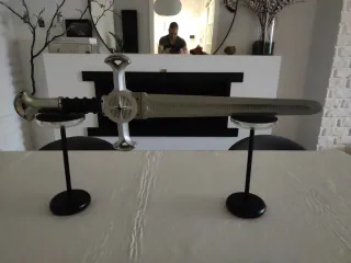 Réplica de la Espada de Aragón, utilizada en la saga de El Señor de los Anillos. Un objeto de colección con un diseño detallado. - Empuñadura con detalles plateados y negros. - Guarda con un símbolo central circular. - Hoja larga con inscripciones grabadas. Es de plástico y tiene sonido cuando golpeas