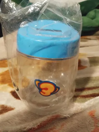 Hucha transparente con un divertido diseño de Tres cat. - Tapa de color azul. - Adhesivo decorativo de Tres cat en el cuerpo de la hucha.