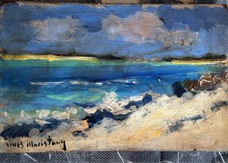 Pintura de Vives Maristany. - Paisaje marino con tonos azules y amarillos. - Textura de óleo con pinceladas visibles. - Firma del artista en la parte inferior izquierda.