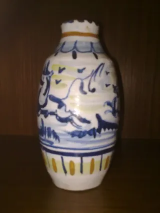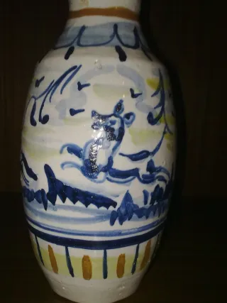 Jarrón de cerámica con un diseño pintado a mano. - Motivos azules y amarillos. - Acabado brillante.