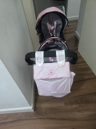 Carro gemelar para muñecas con un bonito diseño. - Color rosa y gris. - Incluye bolso. - Estampado de mariposas.
