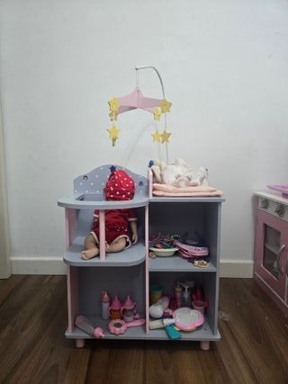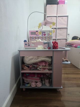 Divertido cambiador para muñecas con múltiples compartimentos. - Incluye bañera y armario. - Diseño en tonos grises y rosas. - Móvil con estrellas decorativas.
