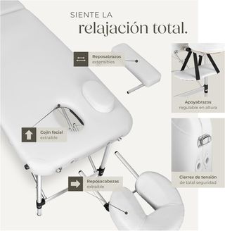 Camilla de masaje plegable, ideal para profesionales o uso doméstico. Fácil de transportar y almacenar. Regulable en altura. NO SE HA USADO NUNCA. - Reposabrazos extensibles. - Cojín facial extraíble. - Reposacabezas extraíble. - Apoyabrazos regulable en altura. - Cierres de tensión de total seguridad.