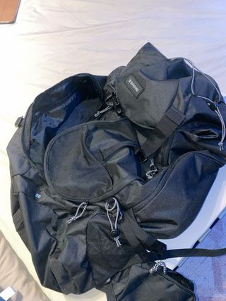 Mochila grande de la marca Simond, modelo 50. - Color negro. - Compartimento principal espacioso. - Bolsillos exteriores. - Cierre con cremallera y cordón ajustable. Acompañado de saco de dormir sin estrenar y un chubasquero. Kit completo perfecto para un viaje o acampada.
