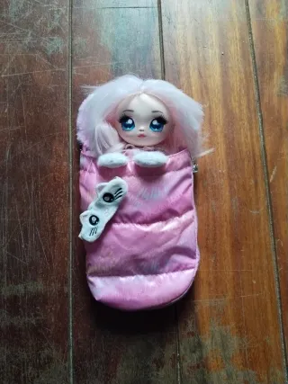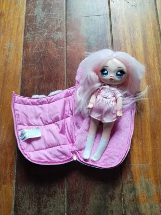 Muñeca pelo rosa con saco dormir y antifaz