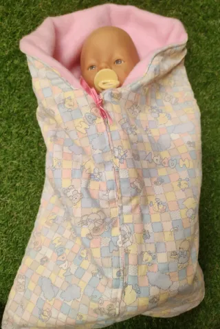 Muñeco Baby Born con su saco de dormir. - Saco de dormir con estampado de cuadros y ositos. - Forro interior rosa. - Cierre de cremallera y lazo rosa.