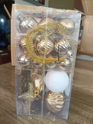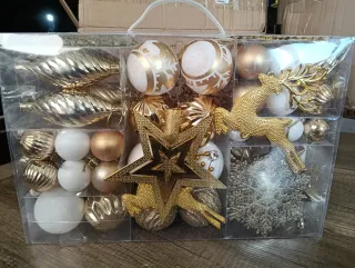 Set de adornos navideños en tonos dorados y blancos, ideal para decorar tu árbol. - Incluye una gran variedad de piezas. - Diseños variados: bolas, piñas, estrellas y renos. - Acabados brillantes y texturizados.