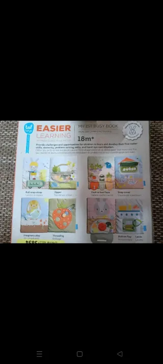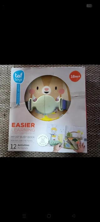Libro de actividades My 1st Busy Book de TAF TOYS, ideal para el aprendizaje temprano. - Diseñado para bebés a partir de 18 meses. - Incluye 12 actividades diferentes. - Fomenta el desarrollo de habilidades motoras finas y la curiosidad. - Confeccionado con materiales seguros y duraderos.