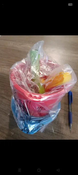 Set de playa con cubo, pala, rastrillo y colador. - Cubo de color rojo. - Pala y rastrillo de colores. - Colador incluido.