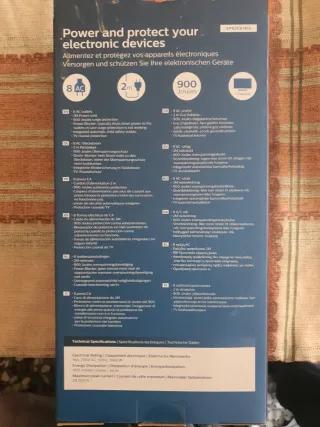 Regleta de enchufes Philips para proteger tus dispositivos valiosos. Cuenta con 8 tomas de corriente y protección contra sobretensiones. - 8 enchufes AC. - Cable de 2 metros. - Protección de 900 Joules. - Conexión coaxial. - Garantía de equipo conectado de hasta €100,000.