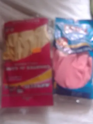 Lote de tres paquetes de guantes. - Dos paquetes de guantes de goma talla 8-8, uno en color rosa y otro en color crema. - Un paquete de guantes flocados talla P con interior de algodón, en color rosa.