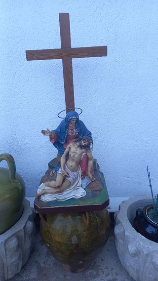 Imagen religiosa de La Piedad, obra de Olot.. la imagen mide con la base incluida sin la cruz 32 cms aproximadamente..la cruz mide 44 cms...para restaurar el dedo meñique. No sé negocia él precio. - Representación de la Virgen María sosteniendo el cuerpo de Jesucristo. - Detallada escultura con vestimenta y expresiones. - Base de la figura decorada.