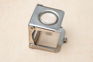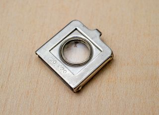 Lupa plegable de precisión con aumento 10× y lente de 20 mm, fabricada en metal, con diseño abatible que protege la óptica cuando está cerrada. Presenta signos visibles de uso y pátina propios del paso del tiempo, pero la lente se conserva funcional y el mecanismo de plegado es correcto. Muy ligera y transportable.