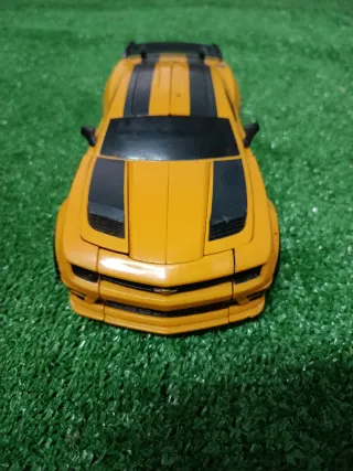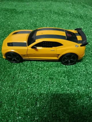 Coche de juguete de color amarillo con detalles en negro. - Diseño deportivo. - Líneas negras en el capó y techo.