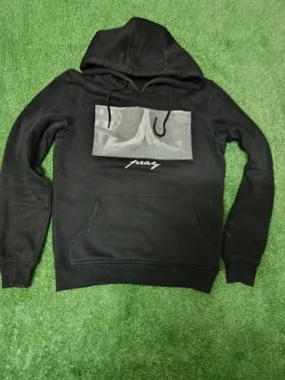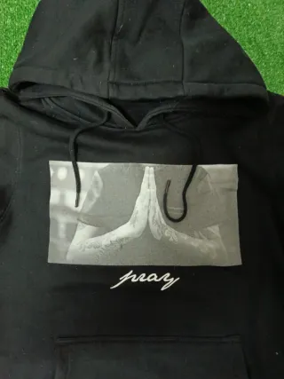 Sudadera negra con capucha y cordones ajustables. Presenta un diseño gráfico en la parte frontal. - Estampado de manos rezando. - Palabra pray escrita. - Bolsillo tipo canguro.