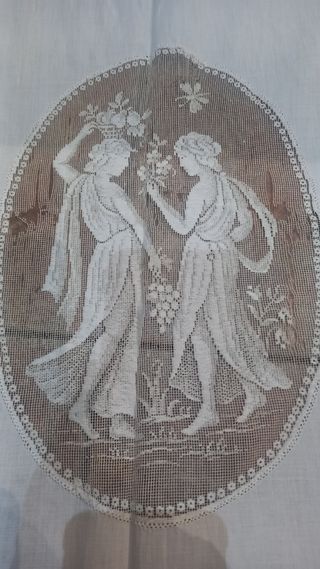 Preciosa cortina antigua con un diseño inspirado en el estilo modernista. Destaca por su delicado encaje y las figuras que la componen...presenta restauracion en algunas partes...de hay su precio...mide 180x220...no sé negocia él precio. DISPONGO DE OTRA IGUAL...COMPRANDO LAS DOS SE CENDEN EN 80€ la pareja. - Tejido de encaje blanco. - Motivos florales y figuras femeninas. - Diseño ovalado.