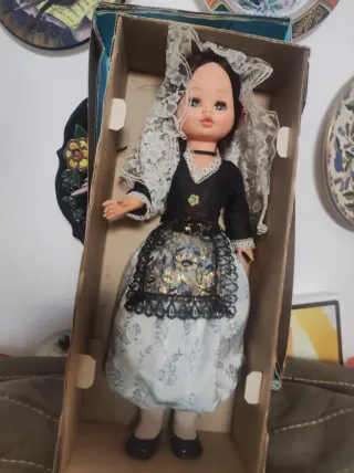 Muñeca clásica con un bonito traje regional. - Vestido negro con detalles blancos. - Encaje en el velo y el cuello. - Adorno floral en el pecho.del tiempo de Nancy