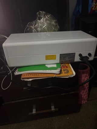 Equipo de depilación Sorisa DE-5000. - Modelo DE-5000. - Pantalla con mensaje de EL PORTAGUJAS NO ESTA CONECTADO CONECTARLO PARA SEGUIR CON LA DEPILACION. - Botón de encendido verde. - Conexiones traseras.