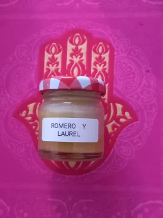 Pomada natural elaborada con romero y laurel. - Ingredientes naturales. - Envase de vidrio con tapa a cuadros.