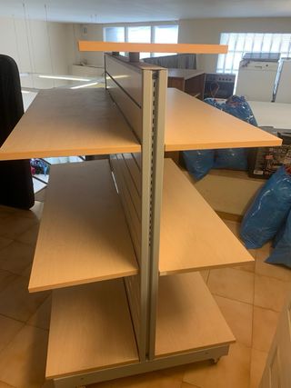 Estanterías de tienda con acabado en madera clara y estructura metálica. Son modulares y fáciles de mover gracias a sus ruedas. - Estructura metálica resistente. - Acabado en madera clara. - Base con ruedas para fácil movilidad.