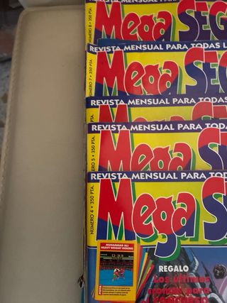 Lote de 5 revistas Mega Sega, publicación mensual para consolas Sega. 10 euros cada una - Números 4, 5, 7, 8 y uno sin número visible. - Incluye artículos sobre Sonic Spinball, Batman Returns y Parque Jurásico. - Cada revista tiene un precio de 350 PTA.