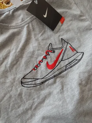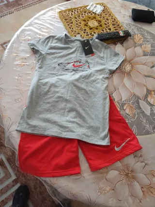 Conjunto deportivo infantil de la marca Nike. - Camiseta gris con estampado de zapatilla. - Pantalón corto rojo con logo. Tengo dos una en talla 10 y otro talla 12 A 12 euros la unidad si te quedas los dos por 20€