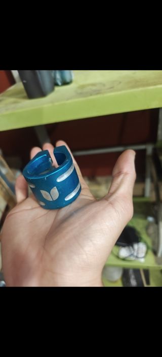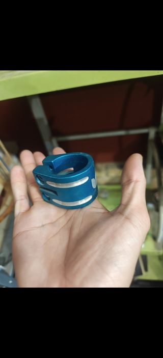 Abrazadera de scooter de color azul brillante. Tiene un diseño moderno con detalles plateados. - Fabricada en aluminio. - Diseño de doble tornillo.