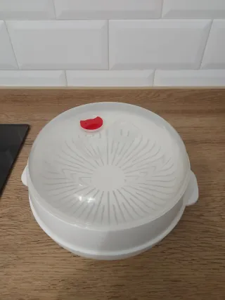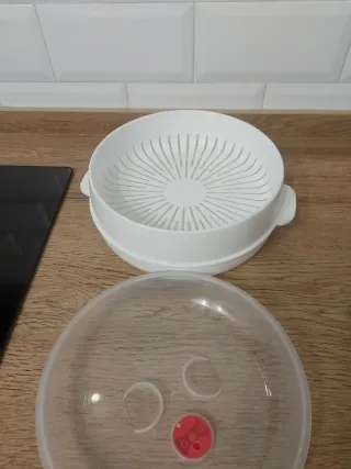 Práctica vaporera de microondas, ideal para cocinar de forma saludable. 25x25x14cm - Color blanco. - Tapa transparente con ventilación. - Asas laterales.