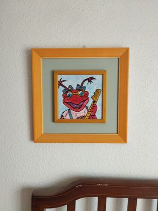 Precioso cuadro pintado a mano, ideal para la habitación infantil. Es una divertida ilustración de una rana con gafas y guitarra. - Pintura acrílica sobre lienzo. - Marco de madera color miel. - Medidas aproximadas: 35 cm (sin marco). - Perfecto estado.