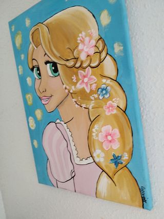 Precioso cuadro pintado a mano de Rapunzel, la princesa de Disney. Ideal para decorar la habitación infantil. Pintado a mano por el artista, acrílico sobre lienzo, con firma - Pintura acrílica sobre lienzo. - Medidas aproximadas: 41 cm (puede variar ligeramente). - Colores vibrantes y detalles delicados.