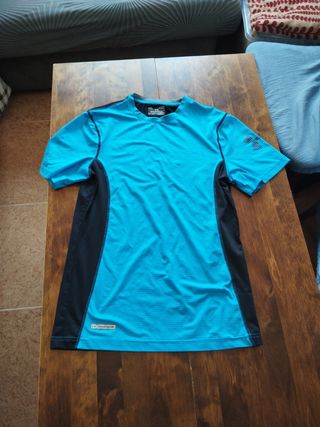 Vendo camiseta deportiva Under Armour de color azul turquesa y detalles negros. Está en buen estado. - Talla: (Especificar talla) - Tejido técnico ligero y transpirable. - Diseño deportivo con paneles negros.