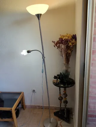 Lámpara de pie con un diseño moderno y elegante, ideal para cualquier rincón de tu hogar. Cuenta con una luz principal superior y un brazo flexible para una iluminación adicional. - Acabado metálico plateado. - Luz superior tipo uplighter. - Brazo flexible con foco direccional.