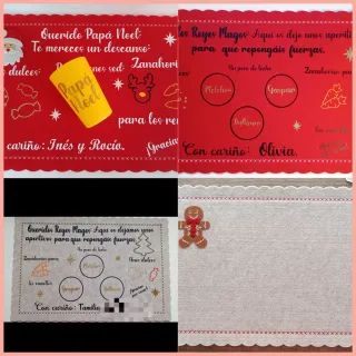 Salvamantel o bandeja temática de Navidad, ideal para dejar los aperitivos a Papá Noel y los Reyes Magos. - Diseño con motivos navideños. - Mensajes personalizados para Papá Noel y los Reyes Magos. - Incluye espacio para leche, zanahorias y dulces. Salvamanteles de fieltro personalizado para dejar preparado la noche de Reyes o para la llegada de Papá Noel o ambos. Disponible solo por una cara (Papá Noel o Reyes Magos) 9€ Por las dos caras Papá Noel y Reyes Magos 13€ salvamantel por las dos caras + 4vasos 20€ Solo para Papá Noel + 1 vaso 11€ Solo Reyes Magos + 3 vasos 15€ Dos modelos disponibles Disponible también en bande