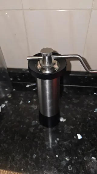 Molino de café manual Kinu Simplicity. Tiene las muelas de serie. Funciona perfectamente para espresso y filtro. - Cuerpo de acero inoxidable. - Diseño elegante y compacto.
