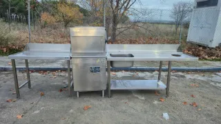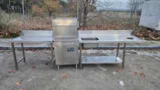 Lavavajillas industrial de capota (cupula) Jemi GS-83. Fregadero con peto,repisa, apertura para residuos y hueco para cubo de basura, mas mesa de salida con peto El peto se pude quitar es desmontable. Perfecto para hostelería restaurantes, colegios, residencias, catering, -Mesa: ancho 113 Fondo 73 Alto 85 -Fregadero: Ancho 1,87 Fondo 73 Alto 85 Poza 50x40 Fondo 27 -Medidas lavavajillas 775x850x1.440 mm. Sin Asa/Abierta: 665x760x1.900 mm. Cesta: 500x500 mm. Ciclo lavado: 2 minutos. Producción Platos/Hora: 640. Altura útil de lavado 400 mm. - Fabricado en acero inoxidable. - Incluye mesa de entrada y salida.