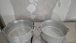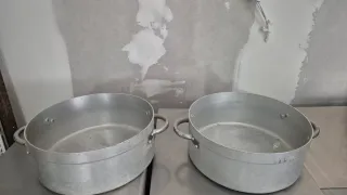 Set de dos cacerolas grandes de aluminio, ideales para uso industrial o profesional. 25€ unidad Medidas 36x36 fondo 14cm - Material: Aluminio. - Diseño: Ovalado con asas. - Cantidad: 2 unidades.