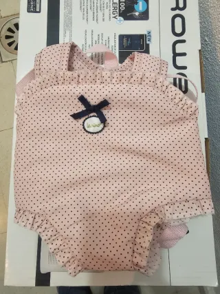 Precioso portal de bebé con estampado de lunares en rosa y negro. Tiene un detalle de lazo y volantes. - Estampado de lunares. - Detalle de lazo. - Volantes en mangas y piernas.