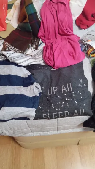 Lote de ropa variada, REGALO Entrego en San Sebastián de los Reyes,NO HAGO ENVÍOS - Camiseta gris con estampado de estrellas y texto UP ALL NIGHT SLEEP ALL DAY. - Camiseta de rayas azules y grises. - Bufanda de lana con diseño a cuadros. - Prenda rosa de tela suave.
