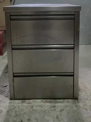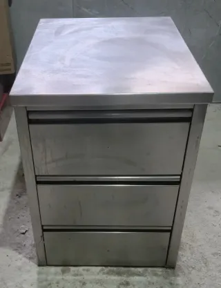 Mesa de trabajo o auxiliar fabricada en acero inoxidable, ideal para cocinas o talleres, o para hostelería se puede poner freidora o cocina de sobremesa Medidas Ancho 48,5cm Fondo 67,5cm Alto 65cm - Superficie lisa y resistente. - Tres cajones para almacenamiento. - Diseño funcional y duradero.