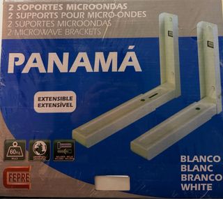 Set de dos soportes para microondas marca Whirlpool, modelo Panamá. Son extensibles y universales. -sin desempaquetar nuevo - Capacidad de carga: 60 kg. - Incluye tornillería para su instalación. - Color blanco